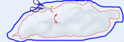We now have realistic cut-out clouds that can be placed on our backdrops or your painted wall. EzKut clouds are real cloud photographs that are modified to be cut out and are printed on special thin plastic for minimum edge and with an adhesive backing. This media is not water resistant so don't get it wet. There are 2 challenges to make your clouds look like clouds or whoops, spilled white paint. Easy Challenge 1 Cutting the cloud from the sheet The cloud has to be cut from the light blue sky (the sky is there only for definition). Clouds are lighter on top with RANDOM (keyword) serrations that vary in size. The bottom is darker and is more flowing waves. Look at the red line on the image below. Before starting, have clean hands. You might consider white or plastic gloves. First cut the cloud roughly from the sky leaving about an 1/2 inch of sky. Then cut along the white edge of the cloud using scissors and using the other hand to rotate the cloud back and forth as you cut. Be RANDOM. On the bottom use less rotation for waves. Keep cutting as you rotate and don't make sharp edges. You can trim a little off if the first cut isn't right as you have about 1 inch to cut before you cut too deep into the cloud. You can leave an occasional light blue as part of the cloud. Little to no blue on top is better with varying amounts on the bottom. Multiple images of the same cloud can be cut differently for different clouds. Getting the bottom to blend is harder than the more defined top.