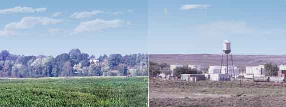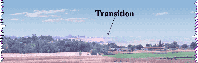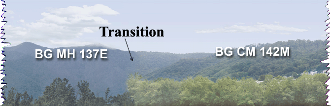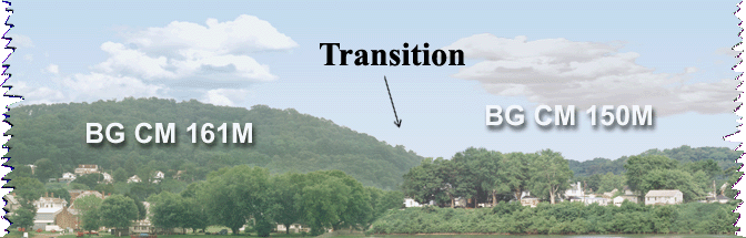 | Results may vary due to sky gradients, heights of horizon and scene similarity as the examples above show. Most sky gradients are the same for the same vertical size and location. Later scenes have a sky code E=Eastern, W=Western. Use some care when picking scenes and matching edges. We can lower the horizon on one scene up to 25% to improve the match. Scenes that are close in color and horizon work best, but if you need a steel mill into rugged mts, then that's what you need. Transitions are $60. The transition fee is not refundable if the scene is returned. Only one scene is modified to match the other. |